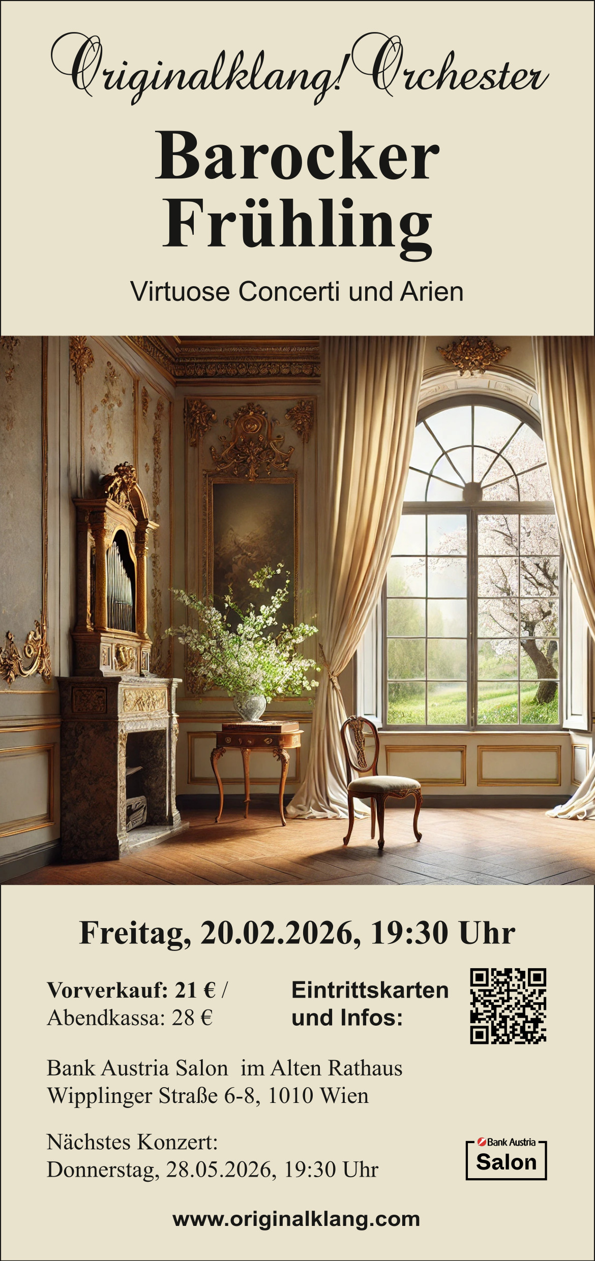 Am Freitag, den 20. Februar 2026, eröffnet das Originalklang!Orchester die neue Konzertreihe mit dem Abend „Barocker Frühling – Virtuose Concerti und Arien“. Im Bank Austria Salon des Alten Rathauses werden charaktervolle Concerti und ausgewählte Arien präsentiert und verleihen diesem Auftakt eine feine musikalische Note.