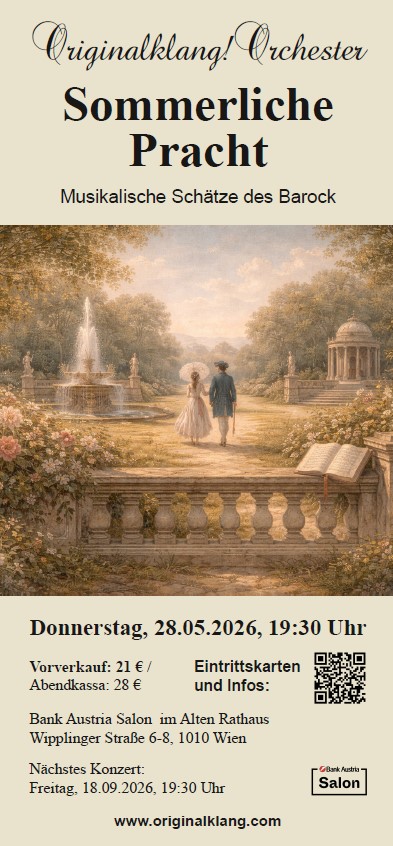 Am Donnerstag, den 28. Mai 2026, setzt das Originalklang!Orchester seine Konzertreihe mit dem Abend „Sommerliche Pracht – Musikalische Schätze des Barock“ fort. Im Bank Austria Salon im Alten Rathaus entfalten ausgewählte Werke des Barock ihre klangliche Farbigkeit und bilden den zweiten Programmpunkt der Reihe in einem stilvollen Rahmen.